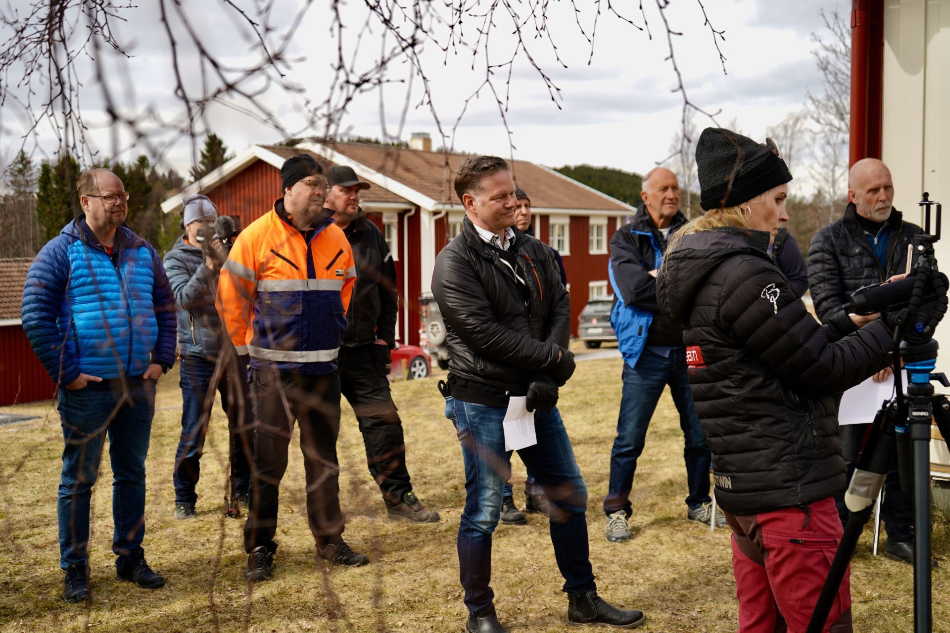 Första spadtagen tas för nybyggnation av Ekobyn Ladriket i Kaxås. Med vid detta historiska ögonblick då även grundaren Dan Olofsson höll tal var bland andra Krokoms kommundirektör Jonas Törngren och Almåsa Alpins ägare Kalle Bäckwall. Projektmotor Karin Bångman sände invigningen live på Facebook för de som inte kunde delta på plats. Foto © Mattias Bångman